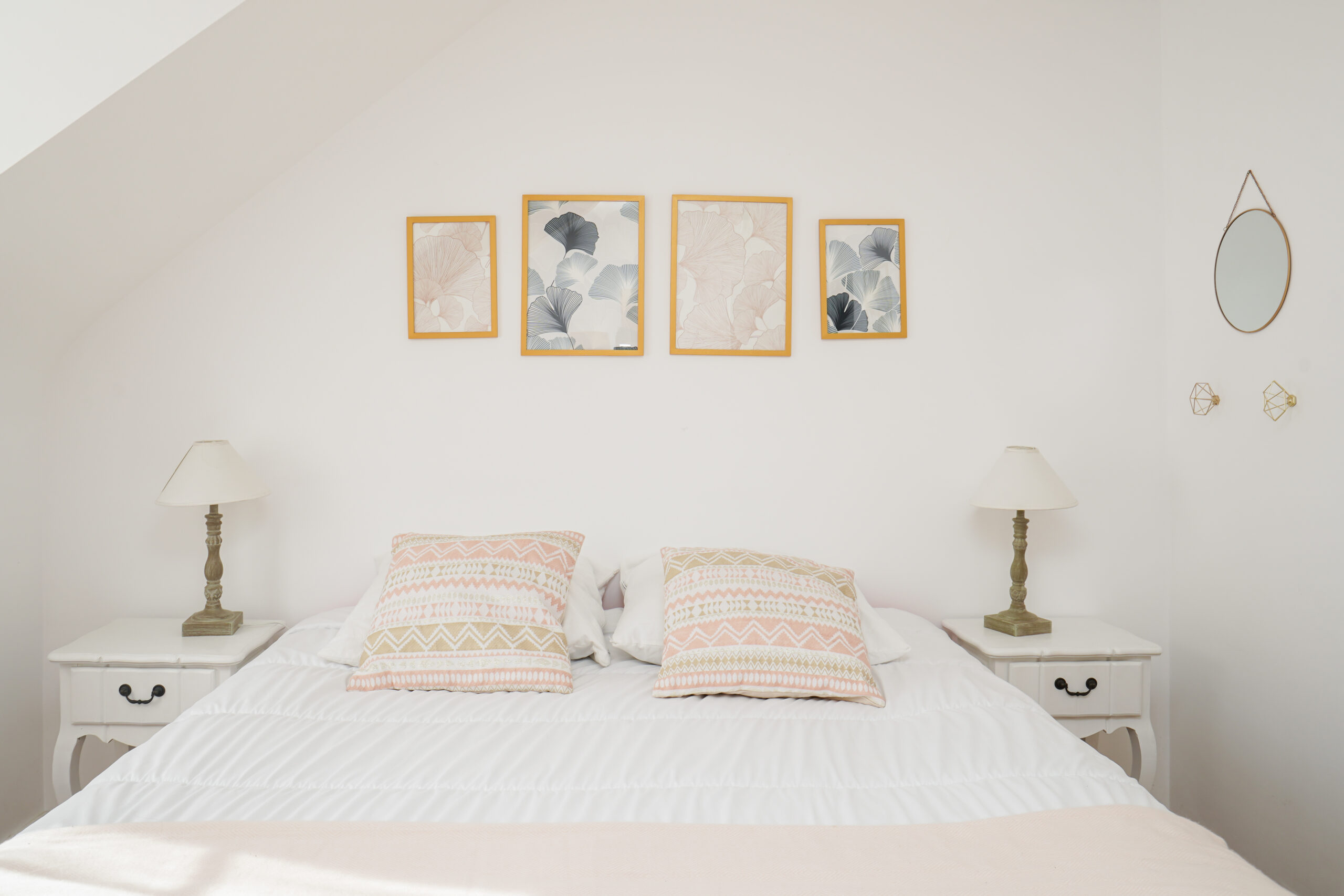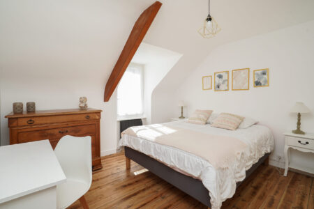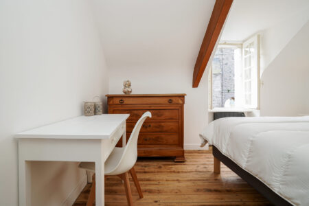 Cette jolie chambre aux tons rose et doré invite à la douceur et au repos. Elle dispose d’un lit double 160×200 cm, d’un placard avec coffre-fort et d’un petit bureau, idéal pour écrire quelques cartes postales ou télétravailler.